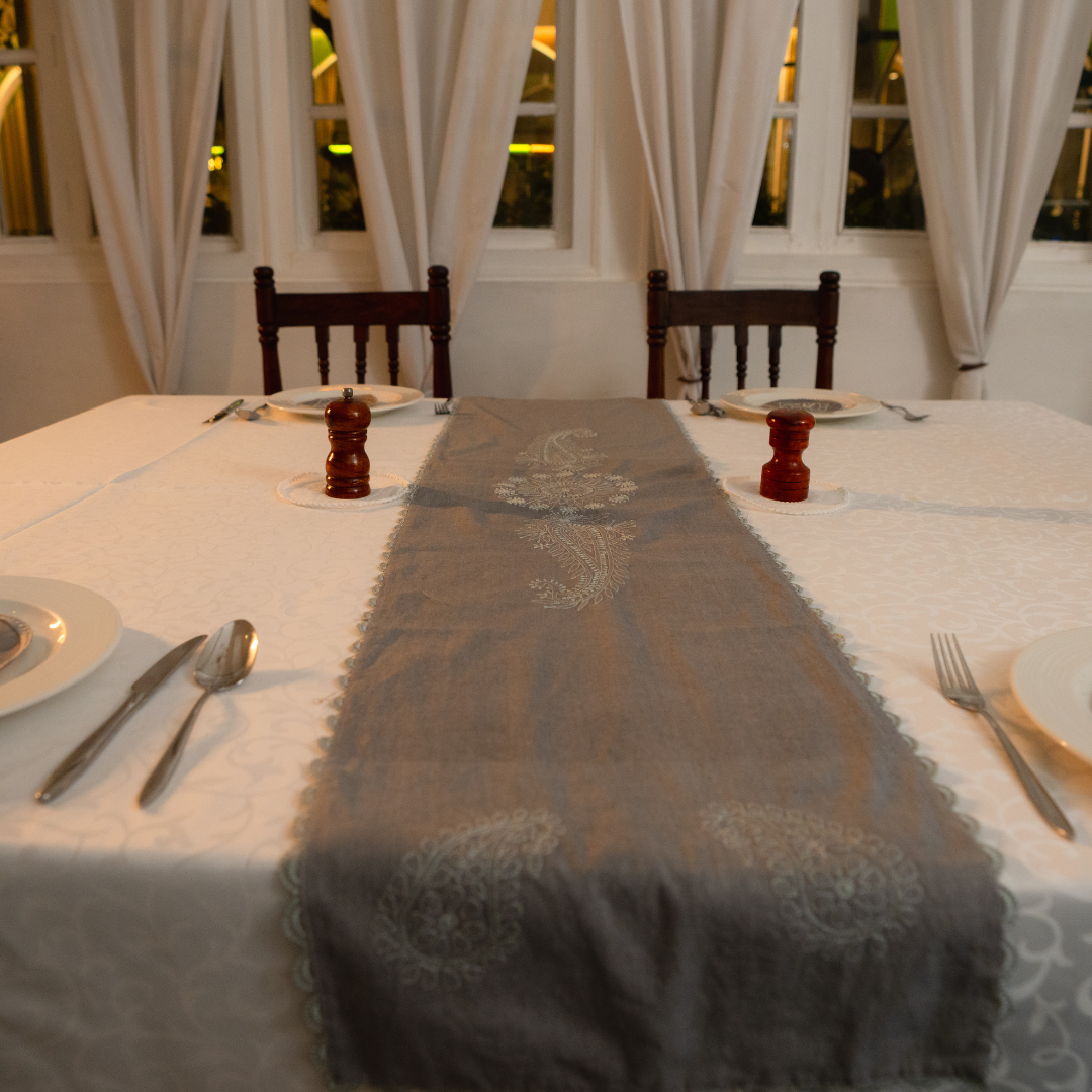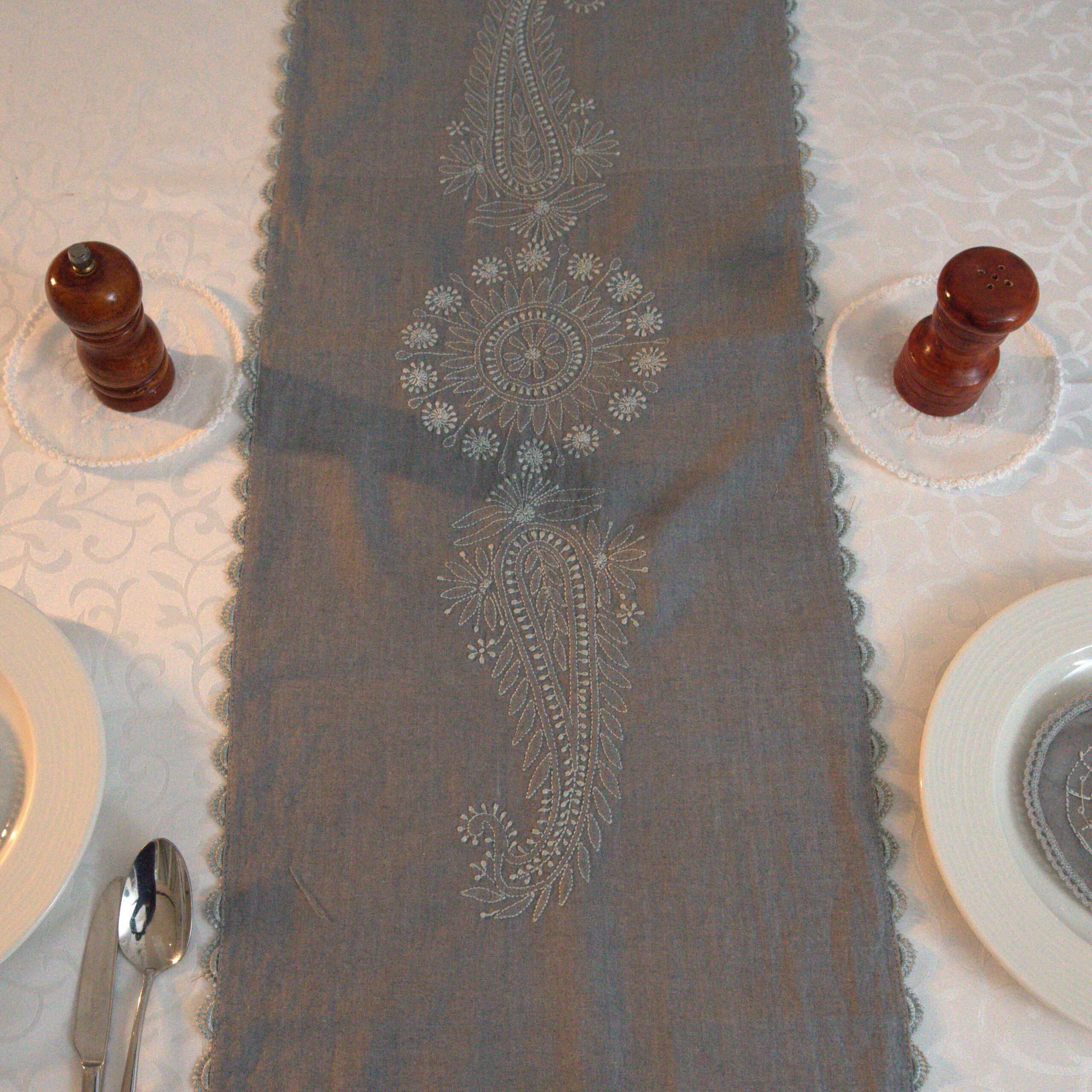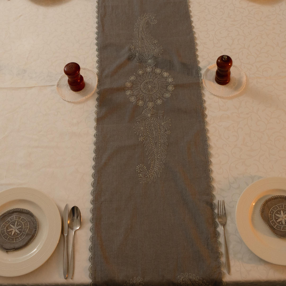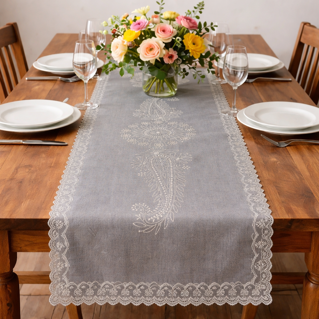 Handcrafted in pure cotton, the Ashmere Grey Table Runner showcases exquisite chikankari embroidery with traditional motifs elegantly placed along the center. Set against a soft grey base, the intricate detailing adds depth and sophistication, while the sleek border lends a clean and refined finish. Perfect for elevating both everyday dining and special occasions with understated grace.