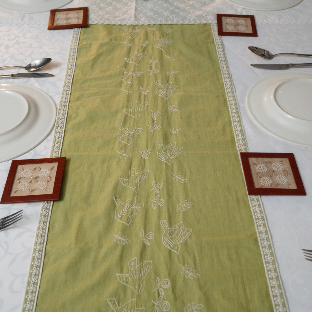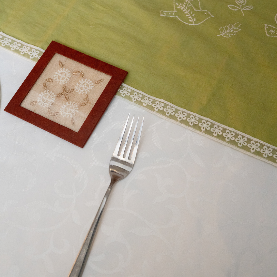 Perfect for elegant living, the Nazrana Silk Chikankari Coaster Set brings heritage craftsmanship and understated luxury to your everyday moments.