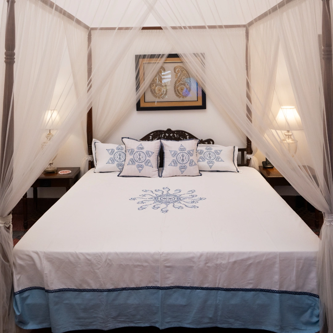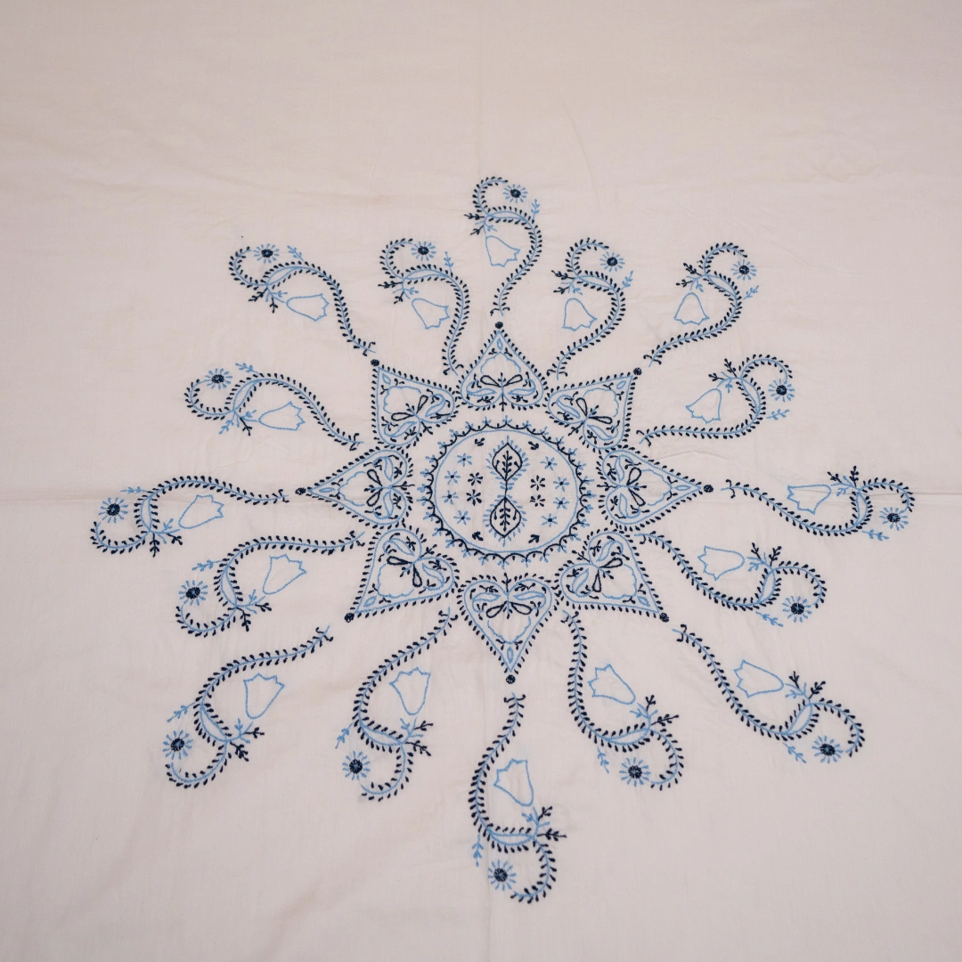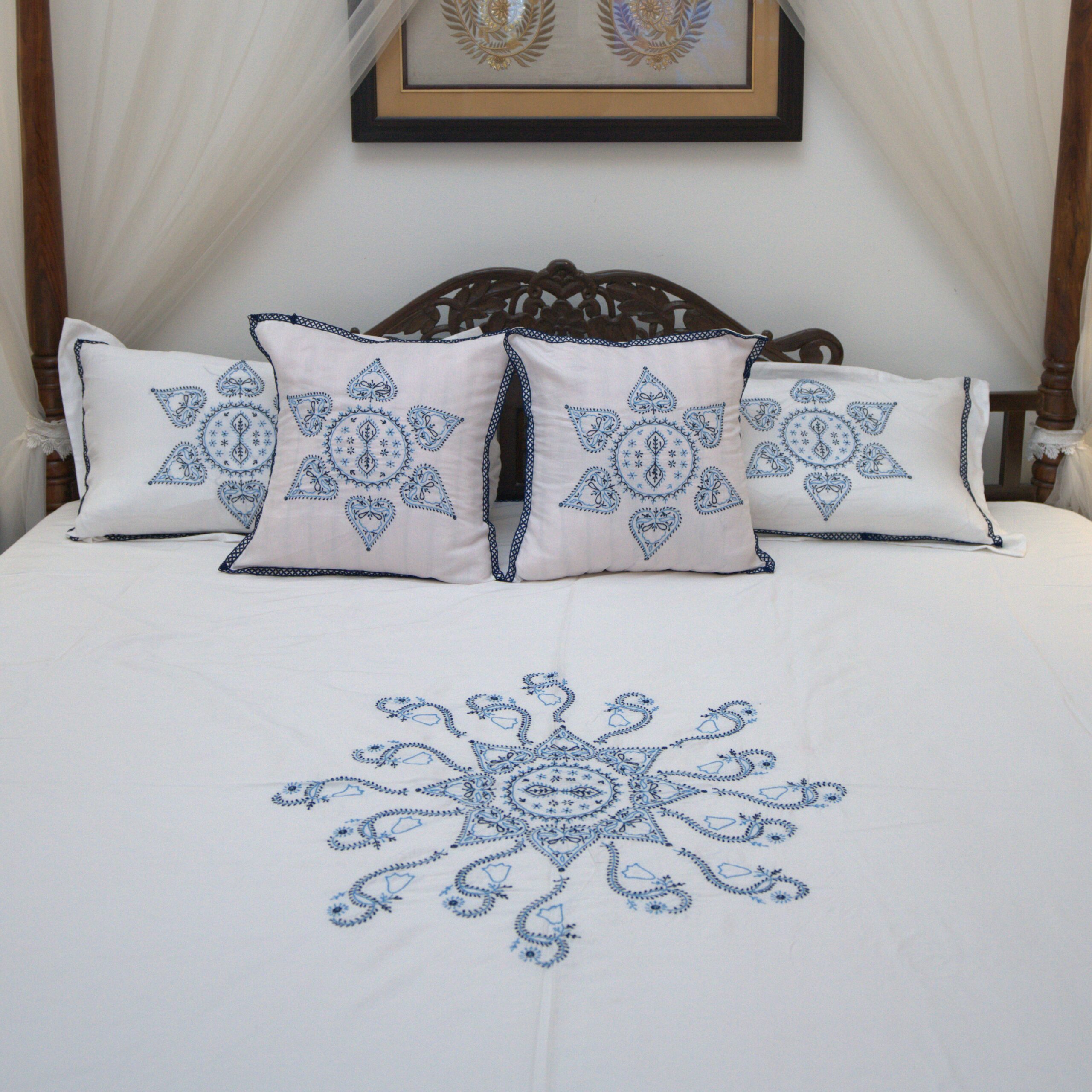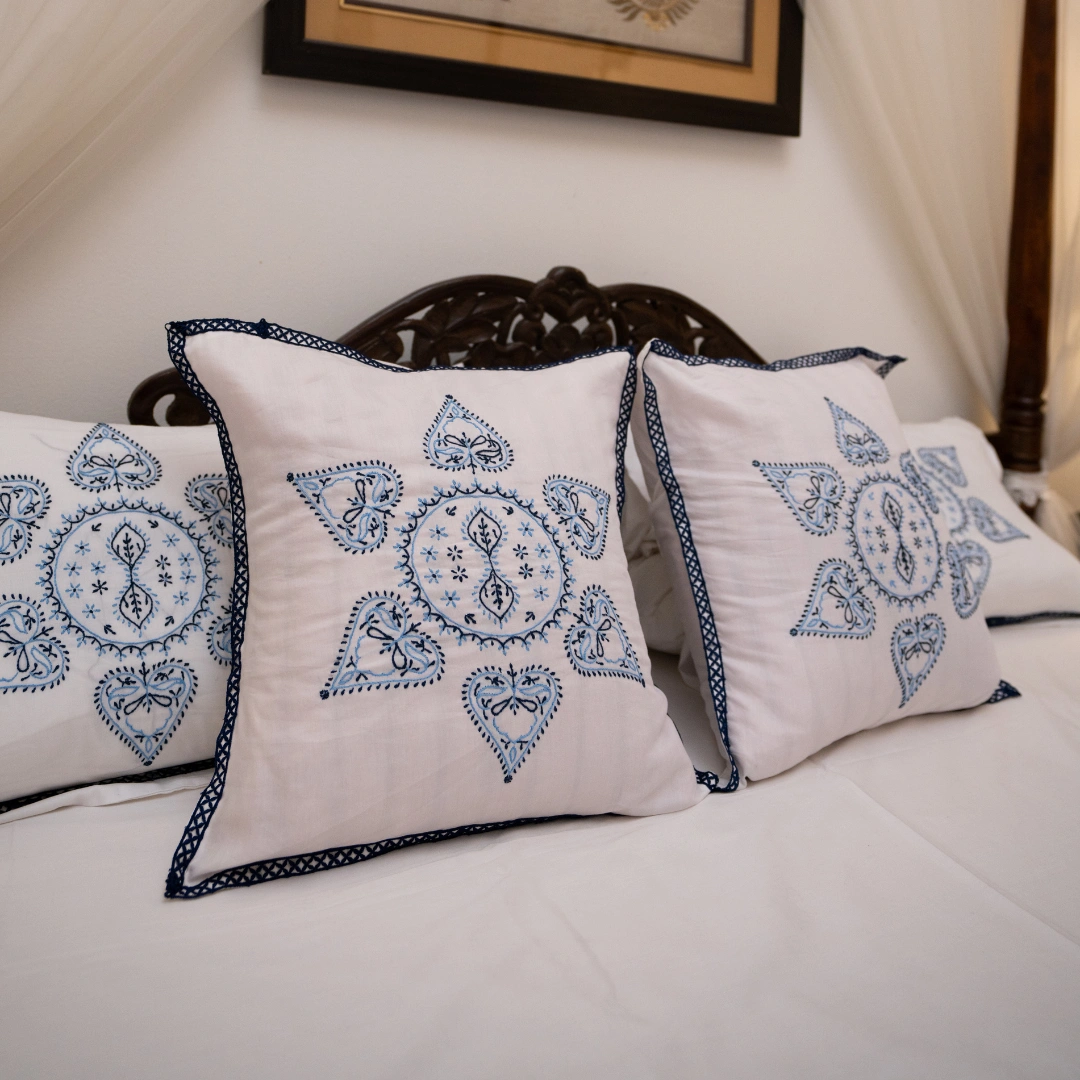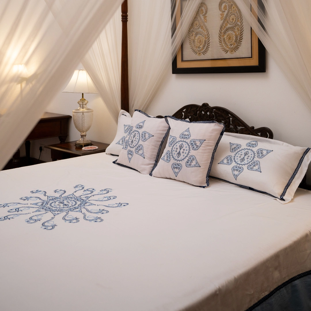 The Azure Whisper bedspread is rendered in a harmonious blend of soft ivory and muted sky blue, crafted from fine cotton that feels light, breathable, and effortlessly elegant. Subtle hand-embroidered motifs unfold gently across the surface, framed by delicately patterned borders that add definition without overwhelming the design. The contrast detailing lends a sense of rhythm and balance, highlighting the artisanal precision behind every stitch. Calm and understated, the palette evokes freshness and clarity, making it equally suited to contemporary spaces and timeless interiors. With its graceful fall and quiet sophistication, the bedspread brings a feeling of serenity and thoughtful refinement to the bedroom—an expression of comfort shaped by craftsmanship and enduring simplicity.