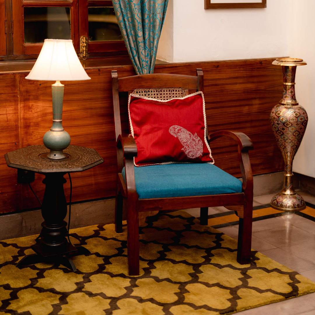 Elevate your living space with this deep maroon cushion cover crafted from premium Tafta silk, finished with intricate hand-embroidered Ambi motifs in soft cream threads. Each cover is meticulously handcrafted by skilled artisans, celebrating timeless Indian heritage while offering a refined, contemporary appeal.